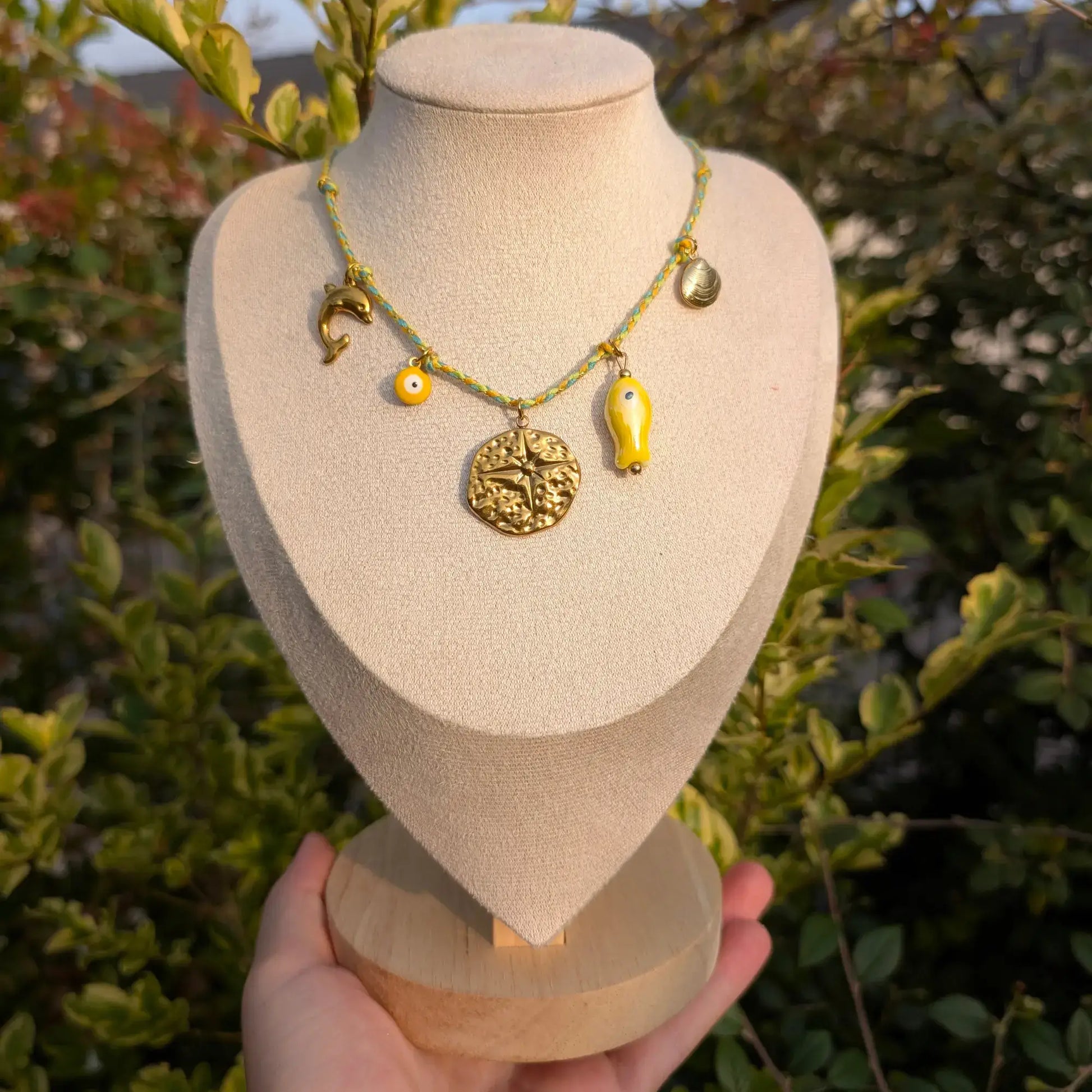 Ce collier cordon coloré tressé à la main incarne toute la magie des côtes corses. Orné de charms dorés et de touches de jaune éclatant, il évoque la mer Méditerranée, les croyances protectrices et les souvenirs d’été ensoleillé.
